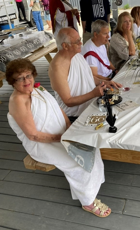 After moving to Raleigh, NC in 1998, she continued to focus her attention on her family and close friends, spending holidays together and travelling to see them both near and far. Her last trip was to Florida in April of 2024 where she saw many close friends and two of her three siblings. She will be remembered for her warm personality and love for her husband, Bill. We can surmise from the picture below that the Kerwin's had a warm and wonderful 60th wedding anniversary party, with togas in place and many friends in attendance.